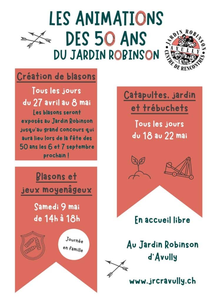 On créé des blasons, seul ou en groupe et on les laisse au Jardin Robinson 🙂 lors de la grande fête des 50 ans, le week-end du 5-6 septembre on proposera un concours de blasons !